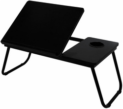Изготовлен из МДФ. Классический дизайн столика хорошо впишется в любой интерьер. Регулируемую часть столешницы можно установить под необходимым для комфортной работы наклоном. Благодаря столику для ноутбука снижается нагрузка на мышцы спины и шеи во время работы с гаджетом. Наличие на фиксированной части столешницы специального углубления даёт возможность разместить на ней стакан или кружку.