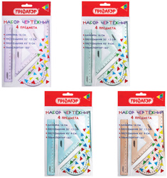 Набор чертежный ПИФАГОР, линейка 16 см, 2 треугольника, транспортир, прозрачный, пастельные цвета, ассорти