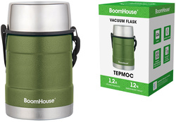 Корпус термоса BOOMHOUSE покрыт молотковым покрытием оливкового цвета, которое не только обеспечивает термосу стильный дизайн, но и препятствует появлению мелких царапин при долгосрочном использовании. Термос снабжен удобным ремешком, регулируемым по длине. В комплекте с термосом поставляется пластиковый контейнер с крышкой. Благодаря диаметру горлышка в 10,5 см можно есть прямо из термоса.